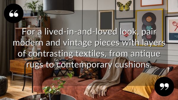 - Mixing your eras: Pairing a modern sofa with a vintage sideboard or a classic antique rug can make a room feel established and loved over time, rather than hurriedly staged.