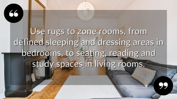 Use rugs for zones in rooms with multiple functions. Think defined sleeping and dressing areas in a bedroom, or seating, reading, and study spaces in a living room.