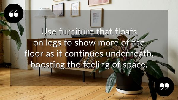 Use furniture that floats on legs to show more of the floor as it continues underneath. Mirrored legs go even further by reflecting the floor and becoming invisible.