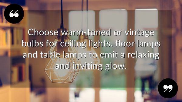 Use warm-toned or vintage bulbs in ceiling lights, floor lamps, and table lamps to emit a relaxing and inviting glow.