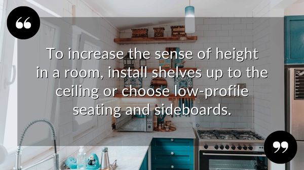Adding floor-to-ceiling shelves, or choosing low-profile seating and sideboards to increase the distance between the tops of your furniture and the tops of the walls.
