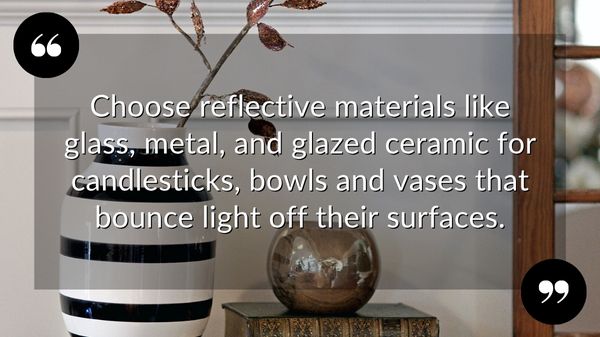 Choose reflective materials like glass, metal, and glazed ceramic for accessories, such as candlesticks, bowls and vases that bounce light off their surfaces.