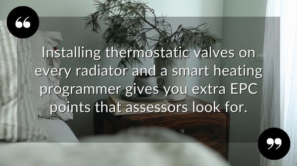- Installing thermostatic valves to every radiator along with a smart central heating programmer gives you extra home-control points that EPC assessors look for.