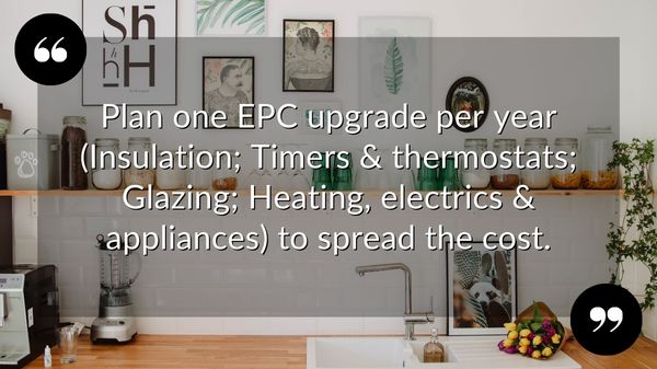 - Plan one major upgrade per year (Insulation > Timers and thermostats > Glazing > Heating, electrics and kitchen appliances) to spread the cost across the longest possible period.