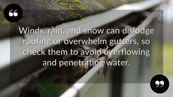 - Winds, rain, and snow dislodging roofing or overwhelming gutters and drainpipes, allowing water to seep into the structure and weaken it with penetrating damp.