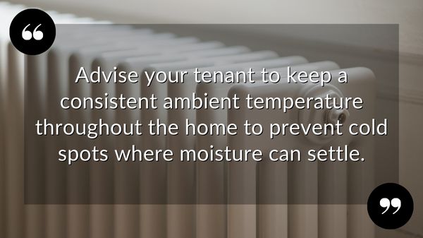 - Advising your tenant to keep a consistent ambient temperature throughout the home to prevent cold spots where moisture is most likely to settle.