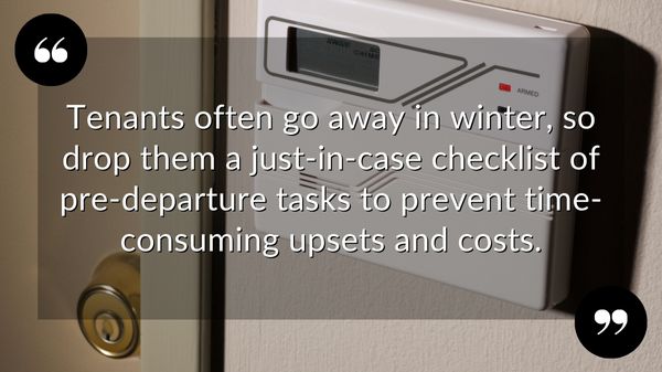 Tenants often travel to visit family or get some winter sun over the holiday period. Unoccupied and unheated homes face multiple risks, so it’s wise to drop your tenants a just-in-case reminder about:
