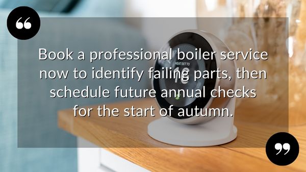 - Book a professional boiler service now to identify failing parts, then schedule future annual checks for the start of autumn.