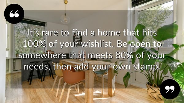 - It’s rare to find a home that hits 100% of your wishlist. Be open to somewhere that meets at least 80% of your needs, and where you can achieve the rest through a few personal tweaks.