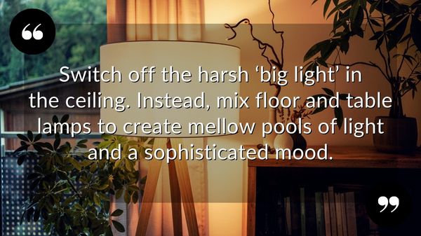 - Switch off the harsh ‘big light’ in the ceiling. Instead, mix floor and table lamps to create mellow pools of light and a sophisticated mood.