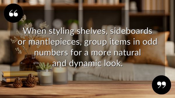 - When styling shelves, sideboards or mantlepieces, group items in odd numbers. Three items of varying heights look more natural and dynamic than rigid symmetry.