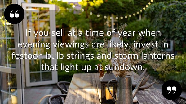 - If you sell at a time of year when viewings after dark are likely, invest in festoon bulb strings and storm lanterns that light up automatically when the sun goes down - instant evening magic.