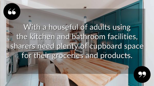 - With a houseful of adults using the kitchen and bathroom facilities, there needs to be plenty of cupboard space to house all their groceries and personal products.