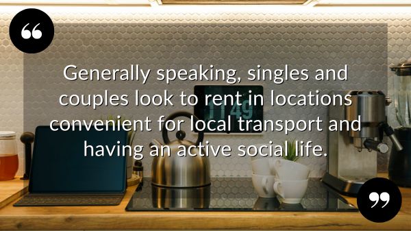 - Generally speaking, singles and couples look to rent in locations convenient for local transport and having an active social life.