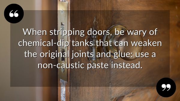 - When stripping doors, be wary of chemical-dip tanks that can weaken the original joints and glue. Apply a non-caustic paste like Peelaway or Kling Strip, or use a heat gun and scraper.
