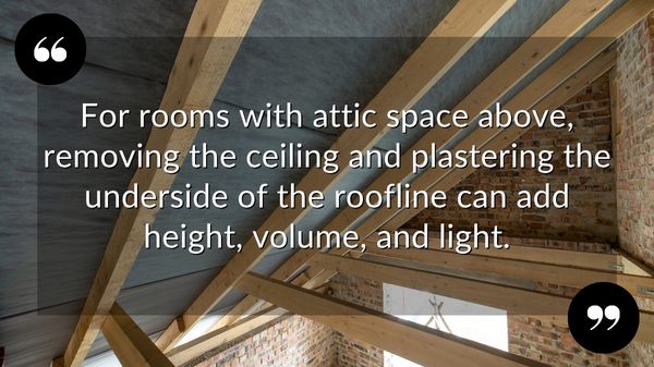 For rooms with attic space above, removing the ceiling and plastering the underside of the roofline can add height, volume, and light while introducing visible overhead beams.